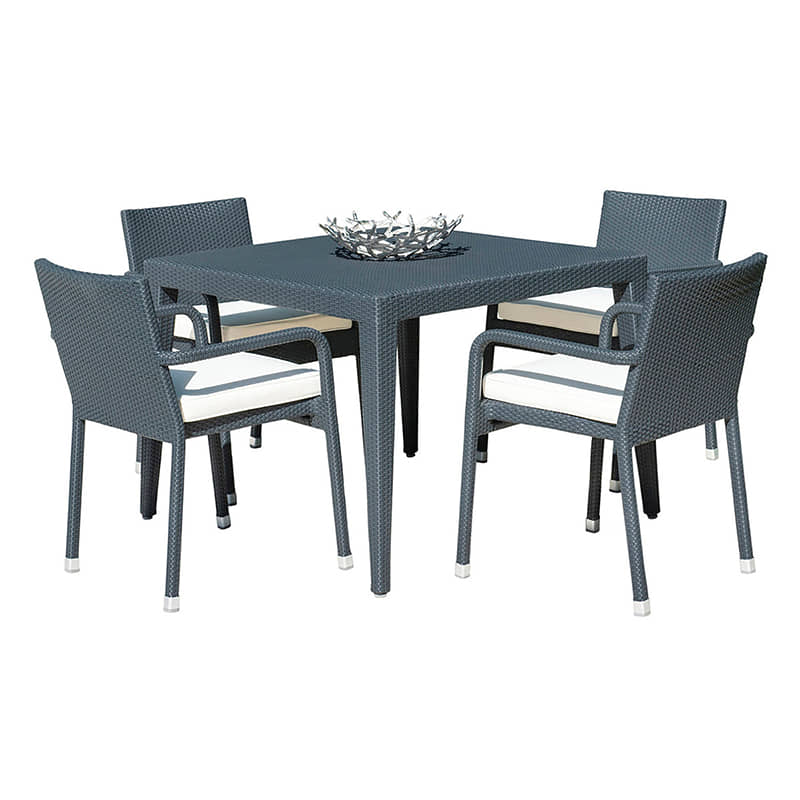 Constructed from deep black and gray wicker high density polyethylene fiber hand woven over aluminum frames, the enriched finish of the Panama Jack Onyx collection will bring the modern ambiance of a top tier resort right to your backyard or patio. Sleek and sophisticated, this dining set is ideal for any outdoor dining space and can be combined with many other items from the Onyx collection to create an outdoor dining area perfectly suited to your needs so you can dine in delight. Additionally, this set includes the glass that complements the 40″ square dining table, as well as off-white outdoor polyester cushions which you can choose to upgrade to one of our many Sunbrella outdoor fabric options.