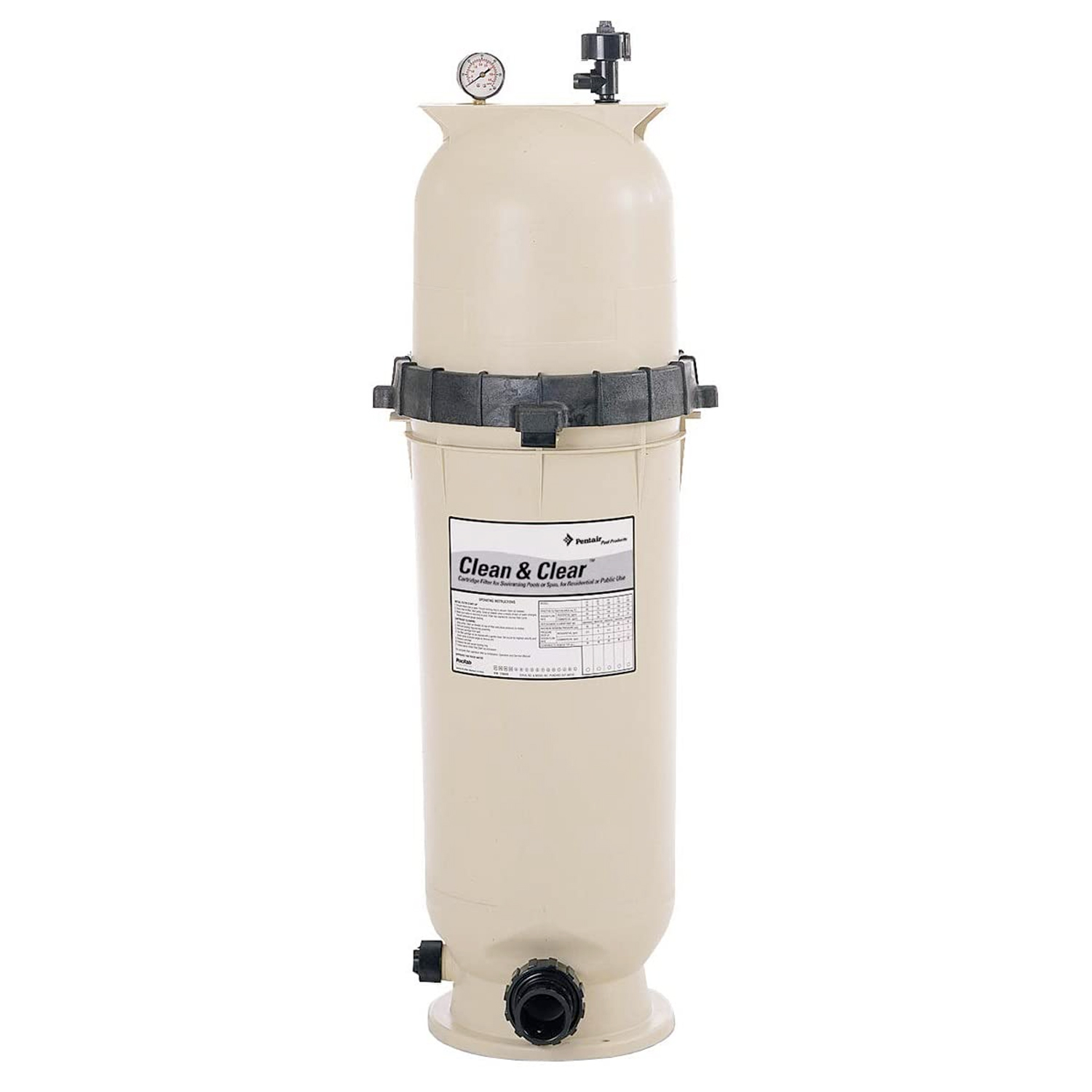 The Pentair Clean and Clear 200 sqft Cartridge Filter Long-lasting Clean & Clear Cartridge Filter with fiberglass-reinforced, chemical resistant, polypropylene tanks are among the simplest to maintain. The easily accessible cartridge can be rinsed clean in minutes with a garden hose. Pool pros love the easy spin-on unions that provide fast hookup and servicing.
