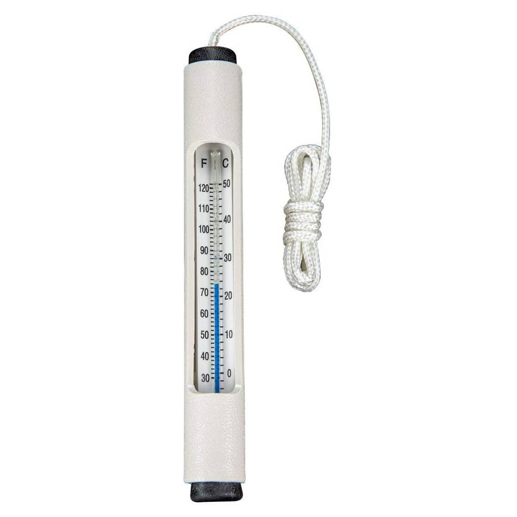 - White plastic thermometer for monitoring water temperature in pools and spas