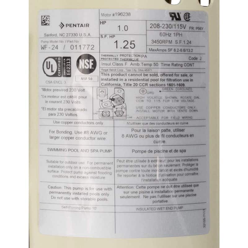 The Pentair WhisperFlo Up-Rated Energy Efficient 1HP Pool Pump delivers maximum circulation efficiency at the lowest operating cost and long, trouble-free life with minimal maintenance. Built with a legendary hydraulic design for pools and pool and spa combinations, this pump is whisper-quiet, self-priming, and built to last. The Whisperflo Advanced FunnelFlo diffuser and high-efficiency impeller maximize flow and reduce noise while the energy-efficient motor with the commercial-grade frame, rustproof stainless steel shaft, and permanently lubricated, sealed bearings uses less horsepower to produce the required flow. This pump is built with a thermoplastic housing to withstand extreme heat and resist corrosion and has heavy-duty threading for dependable worry-free connections. Its cam and ramp 1/4 turn lid makes cleaning simple and fast while an oversized strainer basket extends time between cleanings.