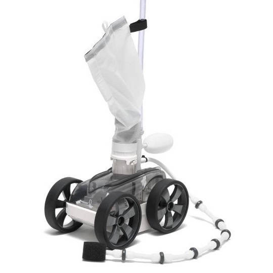 The Pentair White Platinum Pressure Side Pool Cleaner is a reliable and efficient pressure side cleaner that delivers the ultimate in clean. Its four-wheel design and lightweight frame provides better stability and offers four times the coverage to quickly clean in 1-3 hours. Complete with dual thrust jets, the Platinum maneuvers through the water with ease and its four-wheel drive delivers better floor sweeping and wall climbing ability for thorough performance. The front-wheel drive and heavily treaded tires provide maximum traction on inclined surfaces to assure total pool wall and floor coverage. Four wheel design prevents tipping (common with 3 wheel cleaners) for uninterrupted and unattended performance. The Platinum includes a large capacity filter bag that picks up sand and silt while its huge intake throat picks up large leaves and debris with ease. Powered by a separate booster pump, the Platinum delivers an optimum clean and is perfect for all types of in-ground pools (booster pump not included).
