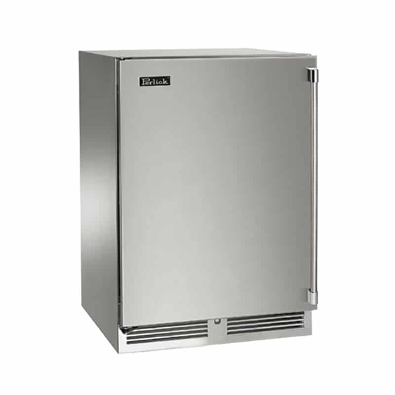 Bring the convenience of refrigeration outdoors with the Perlick 24-In C-Series SS Outdoor Left Hinge Refrigerator. Inspired by Perlick’s award-winning commercial refrigeration offering, the Perlick C-Series Outdoor Refrigerator provides maximum capacity for storage of food and beverages. Available in-door and drawer models to provide customized refrigerated storage solutions for your outdoor living space. Perlick C-Series under counter refrigeration combines luxury and affordability without compromising aesthetics or performance. This Perlick C-Series 24-inch outdoor compact refrigerator, complete with a solid stainless steel door, provides 5. 2 cubic feet of cooled storage. The front-vented, RAPIDcool forced-air refrigeration maintains the temperature to a premium degree from top to bottom between 33F and 42F. In addition to the interior digital temperature control, this unit also features an interior light that illuminates when the door is open, as well as a master switch to turn the light on at all times. Enjoy the peace without sacrificing power with the 525 BTU, whisper-quiet compressor which is quiet enough for residential or office use, and the two-inch thick walls which provide phenomenal insulation and minimized vibrations. The two adjustable, full-extension, vinyl-coated, pull-out shelves are perfectly equipped to store a variety of food or other beverages. The built-in depth and zero-clearance hinge allow the unit to flush fit surrounding cabinetry. As if that was not enough, the industry exclusive convertible door design allows the user to easily convert between wood overlay and stainless steel doors. This unit also features a commercial-grade stainless steel interior and exterior for easy cleaning.