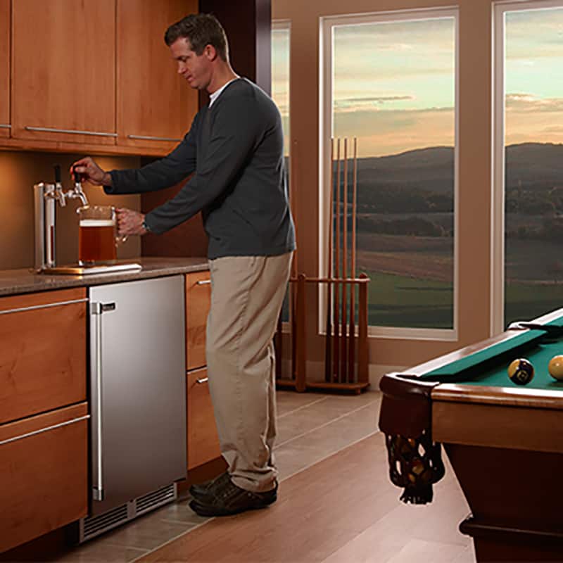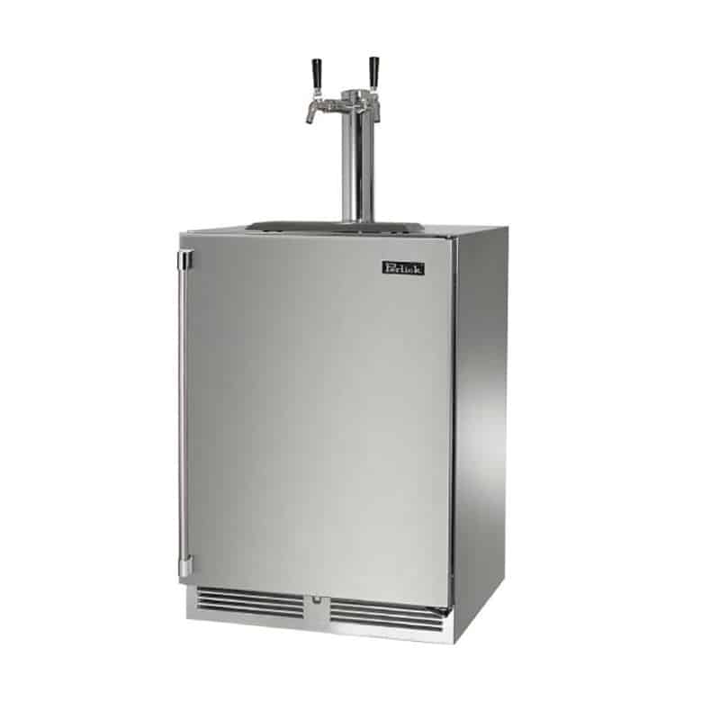 The Perlick 24-In Double Tap Signature Series Outdoor Right Hinge Kegerator pours up to two different types of beer and is UL-rated for outdoor use. Upgrade your outdoor kitchen with the ability to serve ice-cold draft beer. This Perlick Signature Series 24-inch dual tap outdoor kegerator, complete with a solid stainless steel door, provides 5. 2 cubic feet of cooled keg storage. The front-vented, RAPIDcool forced-air refrigeration maintains the temperature to a premium degree from top to bottom between 33F and 42F. In addition to the interior digital temperature control, this unit also features adjustable, interior, Crisp White and Cool Blue LED lighting that illuminates when the door is open, as well as a master switch, to turn the light on at all times. Enjoy the peace without sacrificing power with the 995 BTU, whisper-quiet, variable speed compressor which is quiet enough for residential or office use, and the two-inch thick walls which provide phenomenal insulation and minimized vibrations. This unit can hold one (1) quarter barrel keg or two (2) sixth barrel kegs, and includes a low profile sankey coupler for D system valves. It also includes two Perlick 650SS flow control faucets, allowing you to fine-tune your pour to match your style of beer. The built-in depth and zero-clearance hinge allow the unit to flush fit surrounding cabinetry. As if that was not enough, the industry exclusive convertible door design allows the user to easily convert between wood overlay and stainless steel doors. This unit also features a commercial-grade stainless steel interior and exterior for easy cleaning, and it has a portable drain so no plumbing is required.