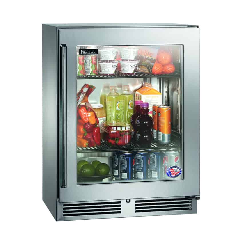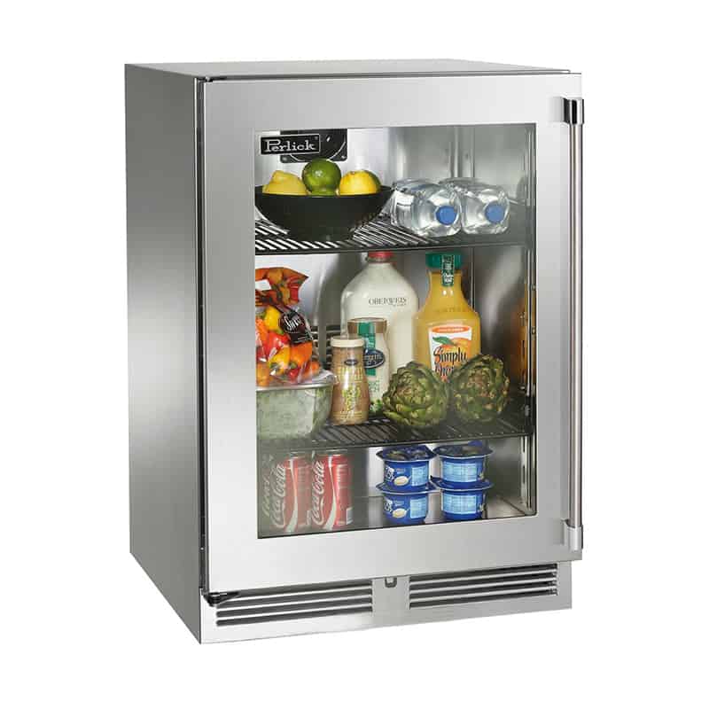 The Perlick 24-In Signature Series Outdoor Left Hinge Glass Door Refrigerator provides food and beverage storage for outdoor applications. Unmatched cooling performance also keeps your products cold no matter what the forecast calls for. The Perlick HP24RO-3-3L is designed with fully-integrated depth and zero-clearance hinging to allow a flush fit with the surrounding cabinetry. The Low E, UV coated glass provides industry-leading insulation and protection. The front-vented, forced-air refrigeration system is powered by an industry exclusive commercial-grade 1,000 Btu Variable Speed Compressor which allows it to be used in any patio, deck, or balcony. Includes Perlick’s one-of-a-kind RAPIDcool forced-air refrigeration system — the industry’s leading cooling system. Temperatures for our outdoor refrigerators range from 33 to 42 degrees Fahrenheit. Insulated walls also help keep cold air in the refrigerator. The glass doors provide additional insulation and durability through a UV-coated and low emissivity, or low e-finish. Industry-best three-year warranty for Perlick outdoor beverage centers and refrigerators, plus an additional three years on sealed systems.
