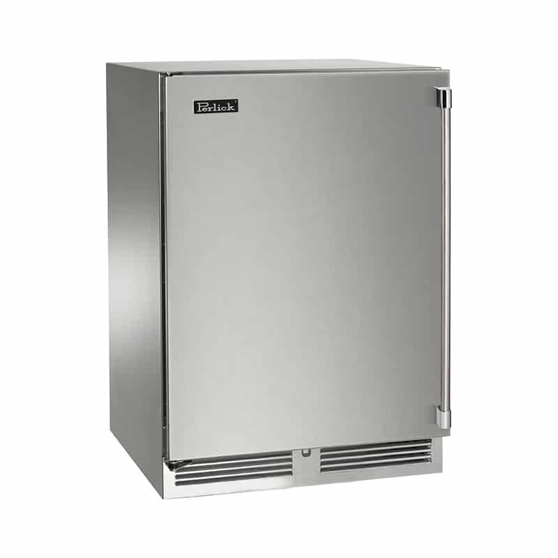 The Perlick 24-In Signature Series Outdoor Left Hinge Refrigerator provides food and beverage storage for outdoor applications. Unmatched cooling performance also keeps your products cold no matter what the forecast calls for. The Perlick HP24RO-3-3L is designed with fully-integrated depth and zero-clearance hinging to allow a flush fit with the surrounding cabinetry. The front-vented, forced-air refrigeration system is powered by an industry exclusive commercial-grade 1,000 Btu Variable Speed Compressor which allows it to be used in any patio, deck, or balcony. Includes Perlick’s one-of-a-kind RAPIDcool forced-air refrigeration system — the industry’s leading cooling system. Temperatures for our outdoor refrigerators range from 33 to 42 degrees Fahrenheit. Insulated walls also help keep cold air in the refrigerator. Industry-best three-year warranty for Perlick outdoor beverage centers and refrigerators, plus an additional three years on sealed systems.