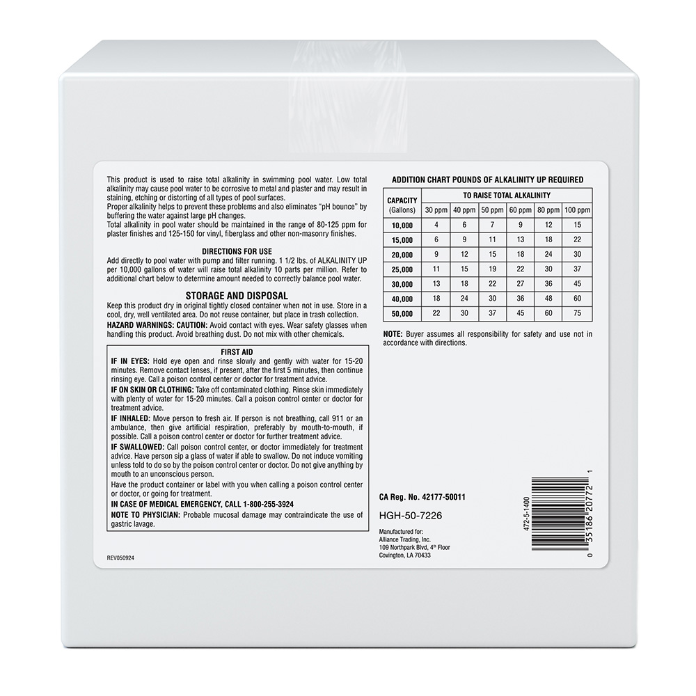Easy-to-use, this granular product raises total alkalinity in the pool and acts as a buffer to prevent pH bounce, staining, and corrosion.