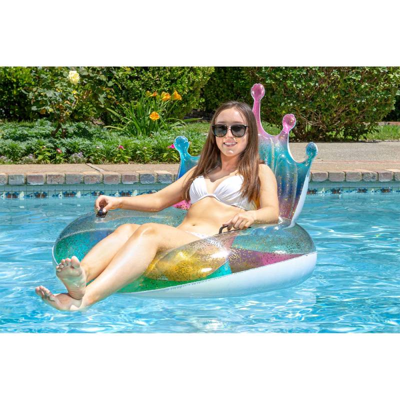 - Glitter-filled inner tube features tiara-shaped backrest that glistens with more glitter