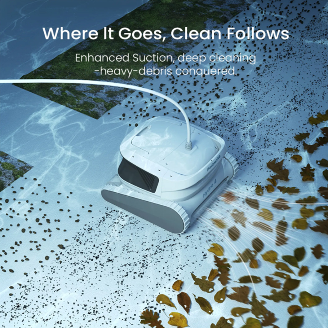 The Hydro 4 robotic cleaner operates independently from your pool’s pump and filtration system, using continuous corded power for uninterrupted cleaning cycles. Intelligent navigation allows the cleaner to move methodically across pool floors and walls, while high-torque drive motors deliver strong suction and scrubbing action to remove dirt, sand, leaves, and fine debris. The internal filtration system captures debris efficiently, helping maintain better water clarity with less manual effort.