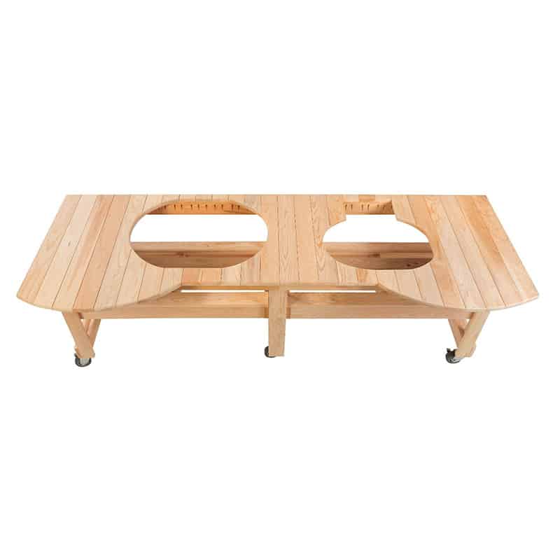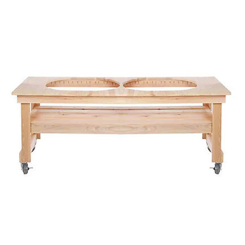 The Primo All Event Cypress Table for Oval XL and Oval JR has been built to offer you versatility and choice. This unfinished cypress grilling station has a wheeled design and will simultaneously accommodate the Primo Oval XL and Primo Oval JR kamado bbq grills, allowing you to choose which size is best to use for the crowd size that you’re entertaining. It’s constructed on four heavy-duty casters, two of which lock to keep the table securely in one place when needed. The Primo Cypress All Event Table for kamado grill is made from classic cypress wood. Cypress woods are known to be sturdy, making them an excellent choice for outdoor accessories. They’re also remarkably resistant to splitting and warping. Though this wood table is untreated, you can choose to either coat it with a sealer – locking in the warm beige color – or allow it to weather to a dark gray. This grilling station offers the best in convenience, durability, and beauty.