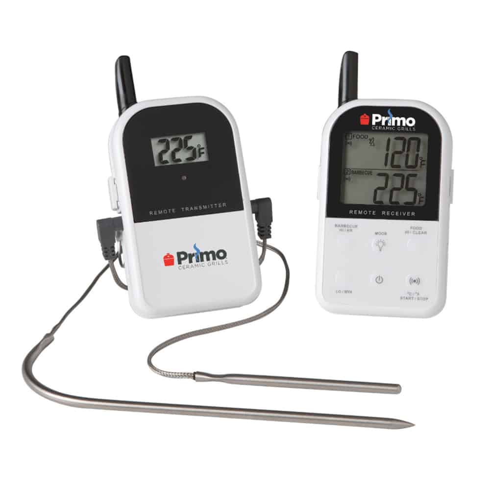 The Primo Digital Remote BBQ Thermometer will help to ensure that your food and grill are at the appropriate temperature at all times. Featuring a base and wireless receiver, this unit provides accurate temperature readings from up to 300 feet away. By placing one heat-resistant probe wire inside your Primo Grill and the other probe into the meat, you can monitor the dome temperature as well as the internal temperature of the meat. The wireless receiver with LCD screen beeps and flashes when meat or temperature goes above your programmed temperature. This Primo Thermometer also features a Count-Up & Count-Down timer and a backlight for use at night. The receiver has a belt clip and a built-in stand for keeping a close eye on your meal. The transmitter has a removable wire stand that also becomes a hanger that can be used with your grill. A special smoking chamber probe wire comes with a clip to attach to the grill rack. (4 AAA batteries included)