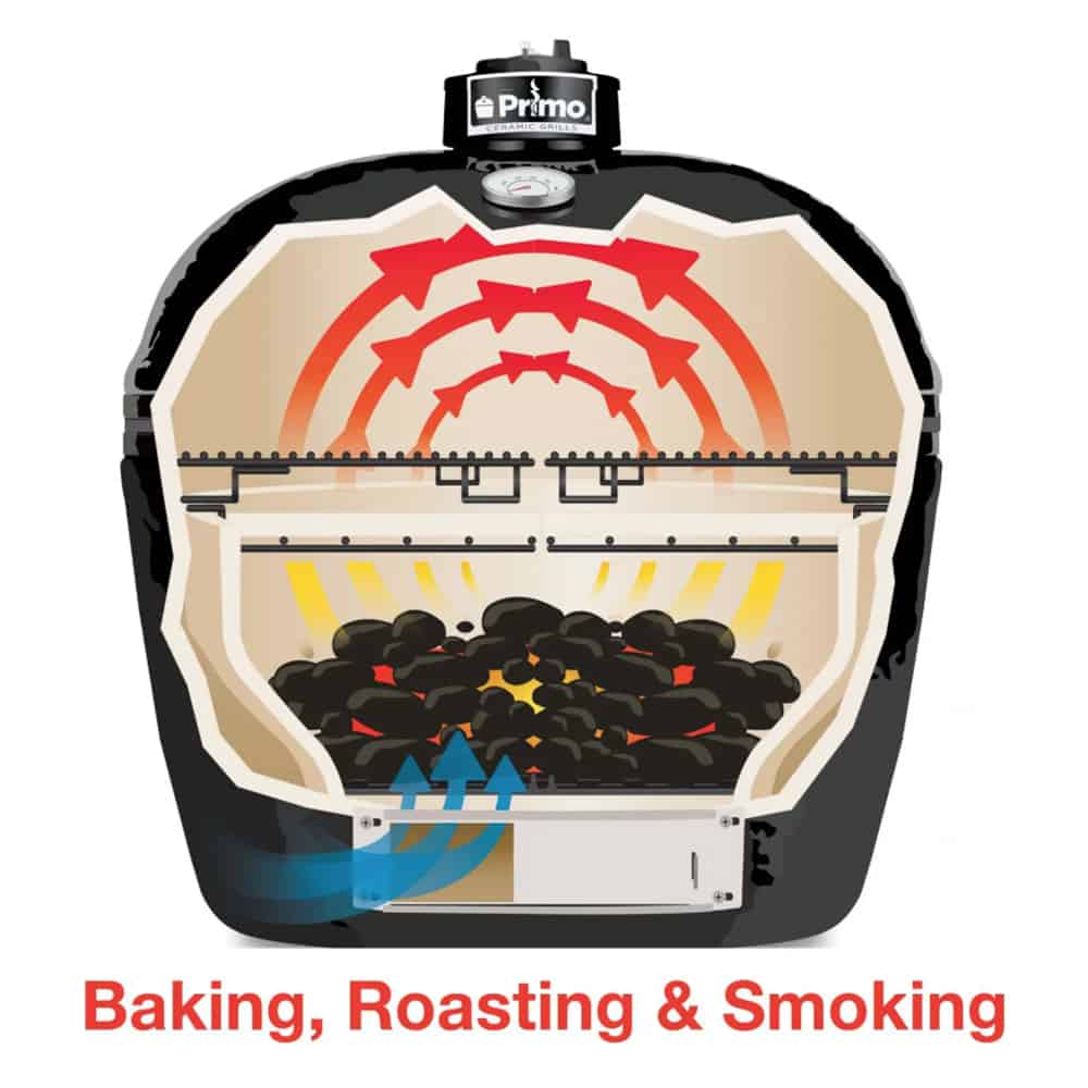 Grill, Bake, Roast, or Smoke All on the Same “Grill”. Primo ceramic grills work like a grill, an oven, a roaster, and a smoker. Simply choose a cooking configuration to meet your needs and cook any recipe…from steaks to bread to beef brisket.