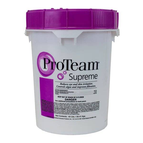 ProTeam Supreme is an enhancer that reduces eye and skin irritation, controls algae, and improves filtration. This product helps maintain stable pH and buffers total alkalinity. Sanitizers work most efficiently when pH is kept in proper range. Supreme is compatible with all forms of sanitization. Best of all, Supreme is made right here in the USA for the highest possible quality, allowing you to buy with confidence.