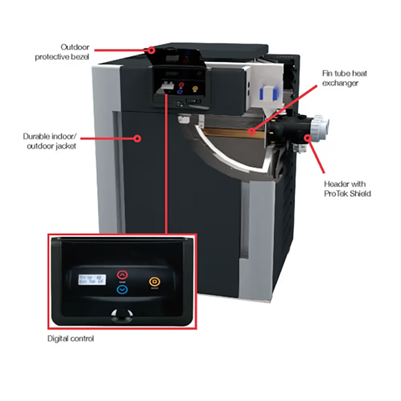With a copper heat exchanger and durable polymer headers, the heater delivers long-lasting performance and corrosion resistance. An electronic ignition system ensures reliable startups, while the self-adjusting burner maintains clean and safe operation even with fluctuating gas pressures. Built to perform in various environmental conditions, this model is ideal for residential pools or spas requiring dependable and straightforward heating.