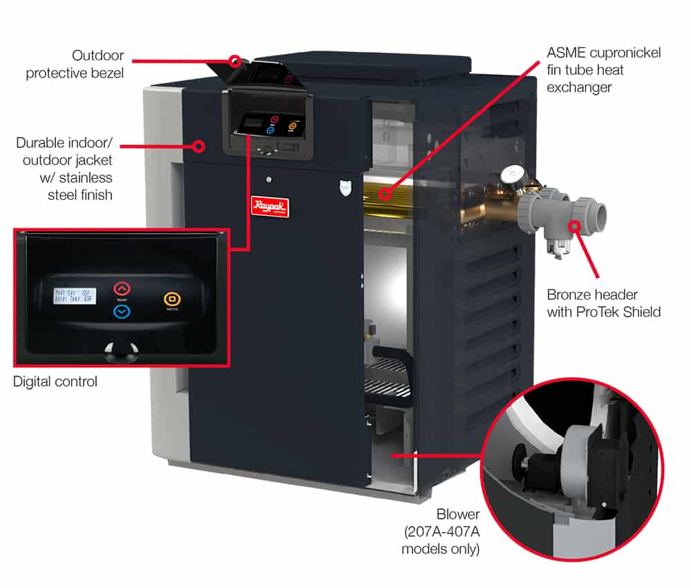 - Protek Shield, A Cutting-Edge Module That Protects the Heat Exchanger and Extends the Life of Your Raypak Digital Pool and Spa Heater