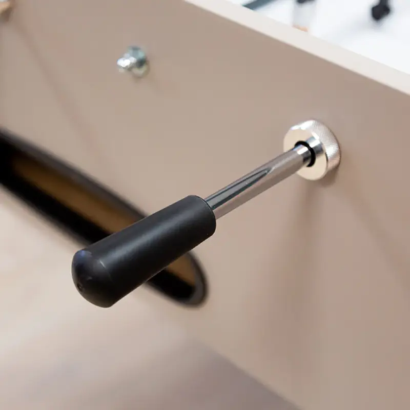 Beneath the refined exterior is a table engineered for stability and consistency. The cabinet’s internal bracing resists torsion, preserving level and keeping the playfield true under competitive play. Shock-damping elements at key contact points help soften vibration and reduce noise, making this a great choice for shared spaces. Adjustable leg levelers come included, allowing you to fine-tune a flat, even surface—even on older floors—so the ball rolls predictably from touchline to touchline. Central ball entry and quick-access goal boxes speed up restarts between points, while the integrated return channels keep the game flowing.