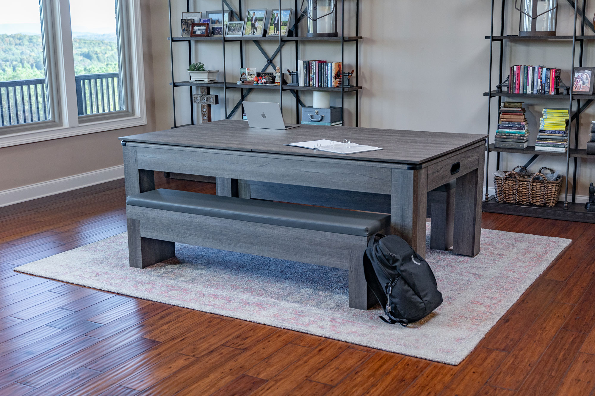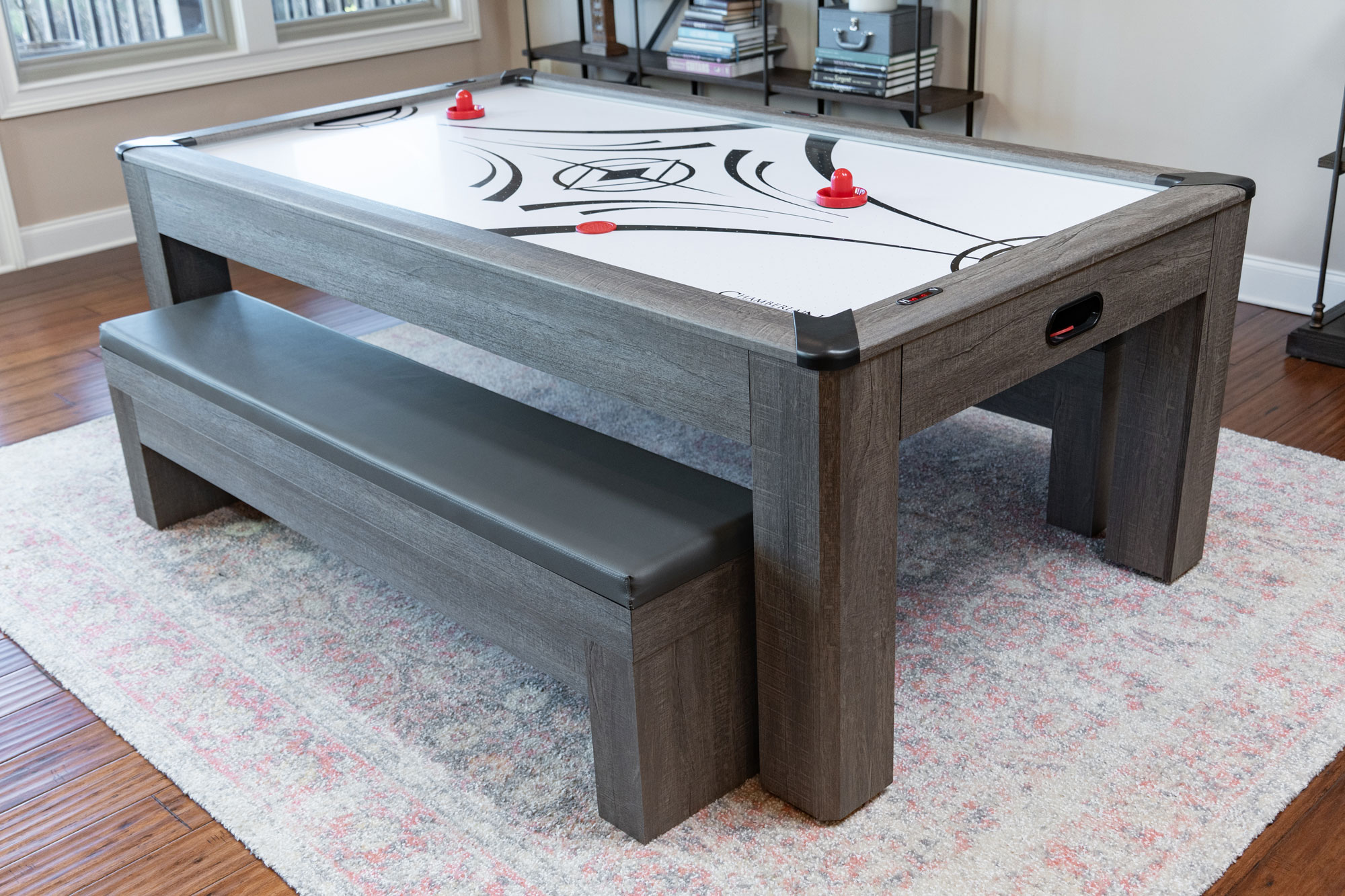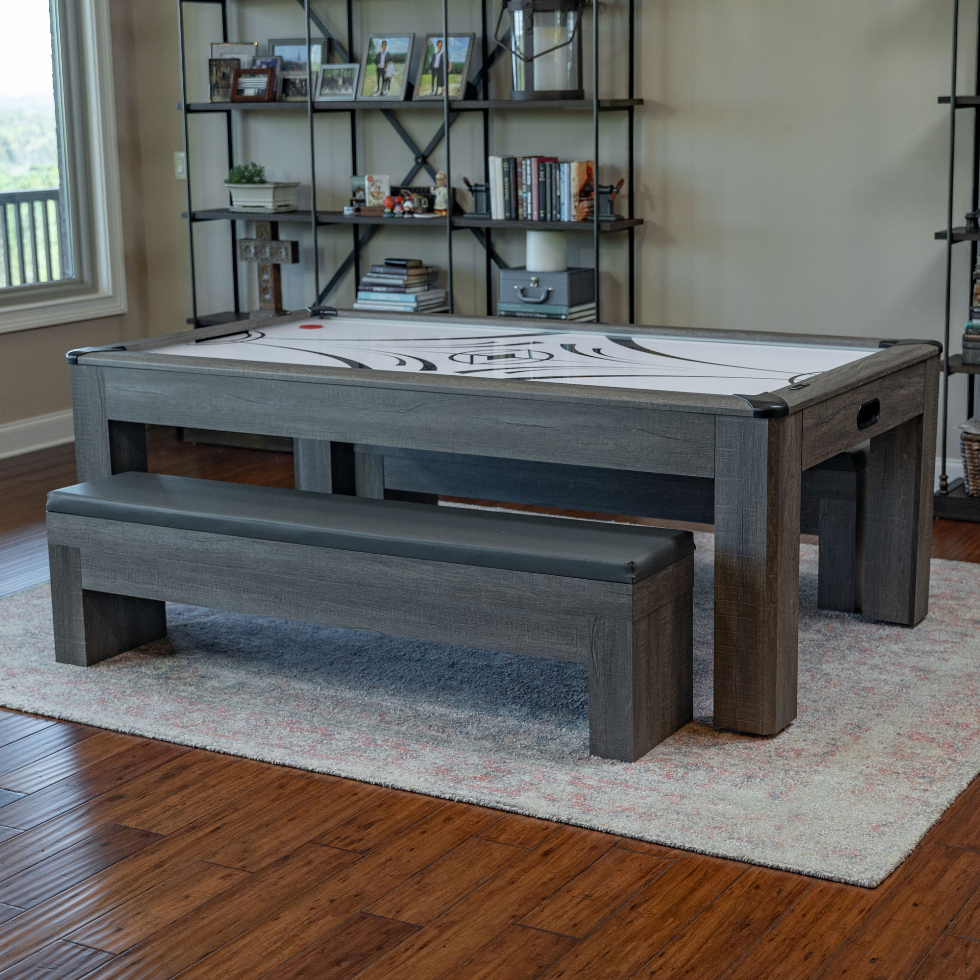 The Rocky Mountain Nights 7′ Air Hockey Table is by far the most elegantly designed 7ft Dining Room pool table on the market today. Within seconds the table is easily converted from a dining or craft table to full-blown competitive table tennis or air hockey table. Crafted from sturdy certified ¾” MDF material covered in a durable driftwood laminate and color matched benches with built-in lined storage and plush leatherette padded seat cushions complete the set. Dual hydraulic easy lifters deliver effortless opening and closing of the bench seat top. Keep your game accessories close to the table and organized while providing comfortable convenient seating. A perfect solution for family gatherings, parties or conference meetings!