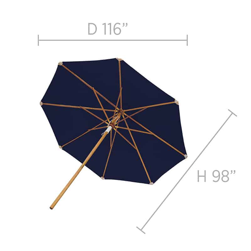 The Royal Teak Collection 10 Ft Octagonal Market Umbrella features a double hoist and all stainless steel hardware. This umbrella is made with rain and dirt repellent fabric, with leather reinforcement at all critical “wear and tear” points for extraordinary durability. Available in Navy, Granite, and Off-White. Navy and Granite are Olefin fabric, while the White is acrylic fabric. The umbrella pole is constructed of 2″ diameter teak wood and will accommodate most patio tables with umbrella holes and most umbrella bases and stands. The span of the umbrella itself is 116″ across and stands 98″ tall. To lift the canopy, just push the hub up and slide the pin in place to keep the umbrella securely open.