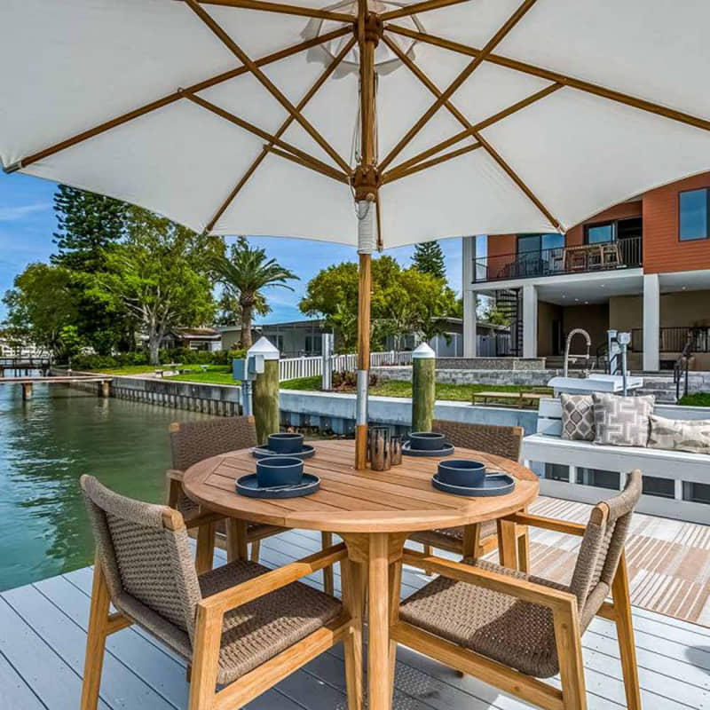 The 50″ Round Dining Tables by Royal Teak Collection has a smooth, modern slat like design with angled, tapered legs for a sleek, sophistication look. Constructed of the highest quality teak which is plantation harvested ensuring the best teak on the market.