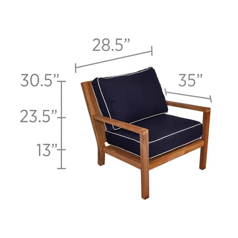 The Royal Teak Collection Coastal Club Chair offers a quality patio chair that will fit beautifully into your outdoor area. This wood has been kiln-dried and machine made with mortise and tenon joints for a sturdy construction. A deep cushion with canvas fabric adds a comfortable seating option and is outdoor rated to withstand the elements. The simple “Coastal” design offers a look suitable for any patio décor. All Royal Teak Collection furniture is constructed of premium plantation-harvested teak. Teak is a very hard, dense wood that has a high oil content, which makes it naturally resistant to moisture, rot, shrinking, warping, splintering, insects and fungus. If left untreated, teak will naturally age to a beautiful silver-gray.