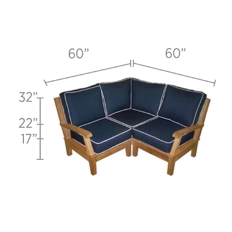 The Royal Teak Collection Miami Sectional Base is the Base Module for the Miami sectional couch. It includes a corner unit and 2 sides w/arms. As the name implies, the Miami collection features elegant coastal style, that when combined with the beautiful look of natural teak wood creates a piece that will fit right into your outdoor area. High-performance Sunbrella fabric envelopes the plush cushions, providing fade-resistant, water-resistant and stylishly comfortable seating. Teak is a very hard, dense wood that has a high oil content, which makes it naturally resistant to moisture, rot, shrinking, warping, splintering, insects and fungus. If left untreated, teak will naturally age to a beautiful silver-gray.