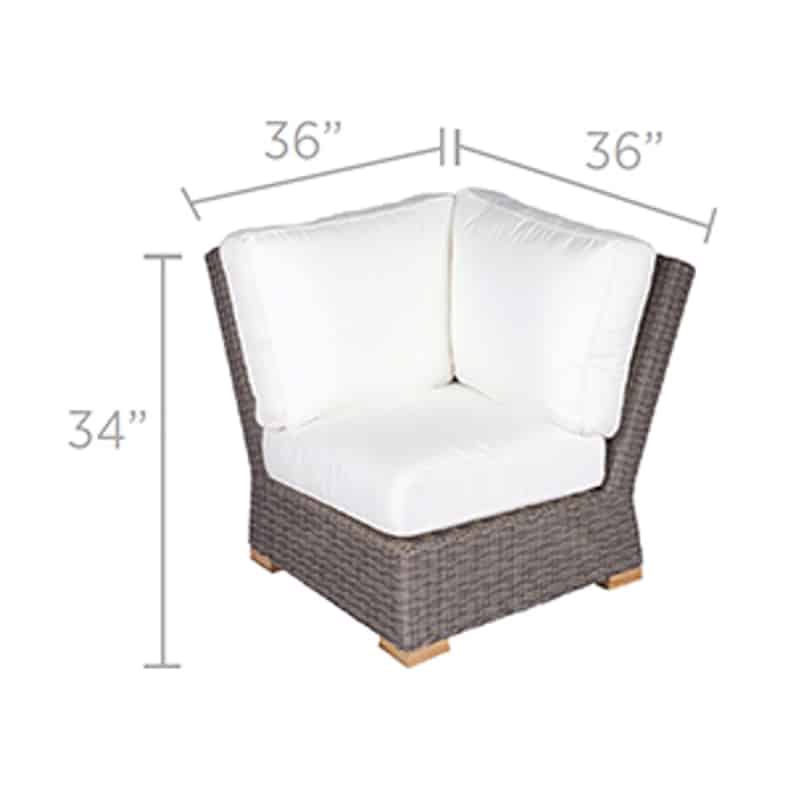The Royal Teak Collection Sanibel Wicker Sectional Corner features all-weather wrapped over a powder-coated aluminum frame or extra durability even in extreme weather conditions. The overstuffed, plush cushions are covered in sturdy, high-performance Sunbrella fabric available in several colors, providing fade-resistant, water-resistant and stylishly comfortable seating. This sectional piece provides great comfort, with functionality and appealing details in mind. Cushions included in your choice of color: Granite, Navy, Spa, or White.