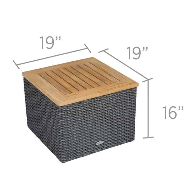 The Royal Teak Collection Sanibel Wicker Side Table features all-weather wicker wrapped over a powder-coated aluminum frame for a beautiful, contemporary style that is wonderfully accented by the natural teak top of this Side table. This table is constructed from premium wicker material and all-natural plantation-harvested teak wood that ensures durability and longevity while the high oil content naturally resists the outdoor elements. The wood is kiln-dried and machine-made, complete with mortise and tenon joints while the wicker base offers a beautiful aesthetic to be integrated into your perfect patio. Teak is a very hard, dense wood that has a high oil content, which makes it naturally resistant to moisture, rot, shrinking, warping, splintering, insects and fungus. If left untreated, teak will naturally age to a beautiful silver-gray.