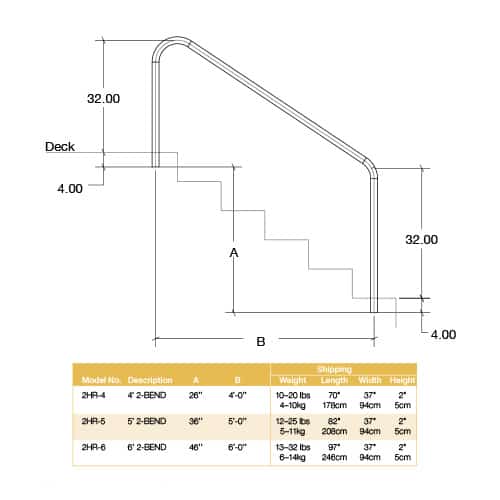 The S.R.Smith 2 Bend Stair Rail comes in a wide variety of lengths to accommodate almost any pool. Constructed of stainless steel, these rails can also be powder coated for additional protection. These S.R. Smith rails are designed to be the right fit for most in ground pools with customization options of different heights and lengths.