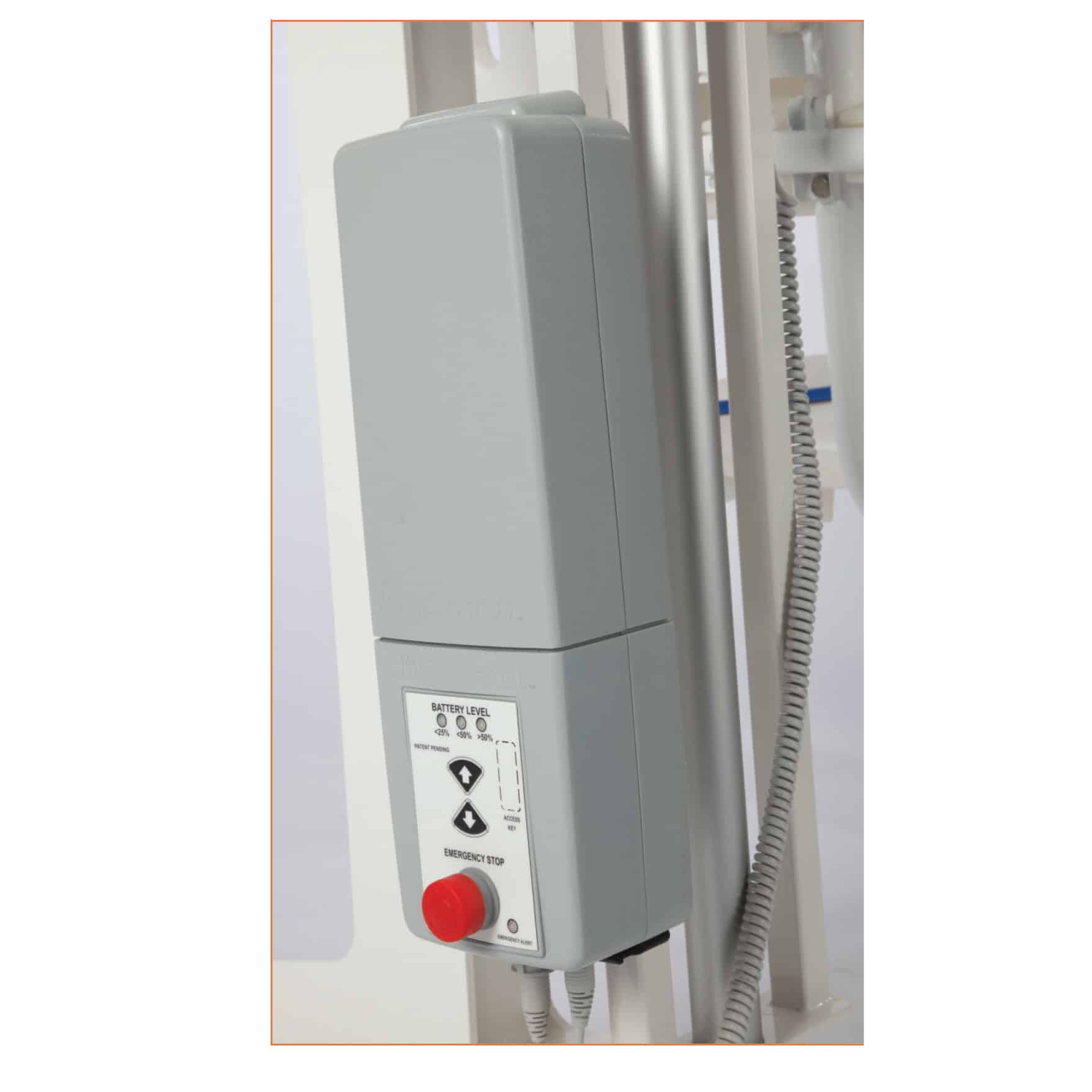 • Emergency stop button sounds an audible alarm and can stop the lift