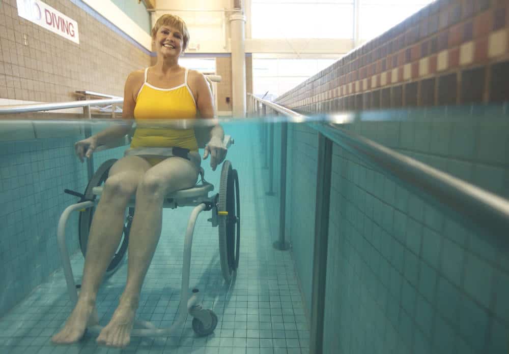The S.R. Smith Mobile Aquatic Chair (MAC) are essential for facilities utilizing a ramp, zero-depth entry or movable floor. The MAC is built specifically for use in aquatic environments with a powder coated stainless steel frame to resist corrosion and a swing away arm for easy transfer. The rigid roto-molded plastic seat aids in user transfer by providing a stable platform that can be used for transfer support. Front and rear stabilizer wheels eliminate the tendency of a chair to pitch forward or back while going down the ramp. Built with a 300 Pound Weight Capacity and 18″ wide seat.