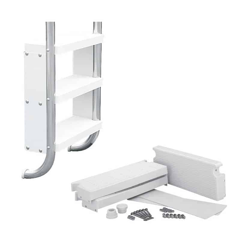 The S.R.Smith Safety-Pool Step Retrofit Kit is available in 2, 3, or 4 step kits for residential ladders. The kit is made of heavy-duty molded plastic with a textured non-slip stepping surface for safety and engineered for use in residential pools. The kit is designed for 10″ spacing between steps and ladders with 1.90 OD tubing and .049 wall thickness. The kit includes treads, protective side skirts, and mounting hardware (US thread).