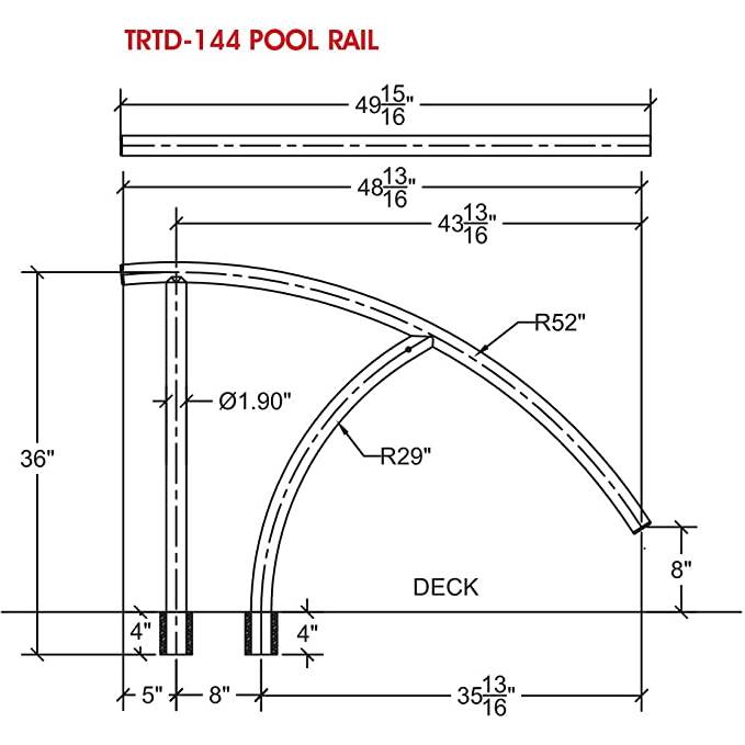 The Saftron TRTD-144-W pool rails are ideal for salt chlorinated pools. Fully reinforced construction provides superior strength and durability. The TRTD-144 has a width of 44″, height of 36″, a top rail length of 48″ and includes escutcheons. Available in white, taupe, beige, gray, graphite gray & black.