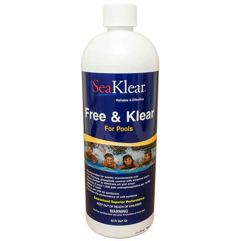 Seaklear Free & Klear is a powerful 3 in 1 formula. This product contains phosphate remover, enzymes and a natural clarifier. Remove at least 1,000 ppb orthophosphates per 10,000 gallons of water and eliminate oil and scum in one easy step. This product is recommended for weekly maintenance and helps to enhance the performance of salt systems, yet also works will all sanitizers.