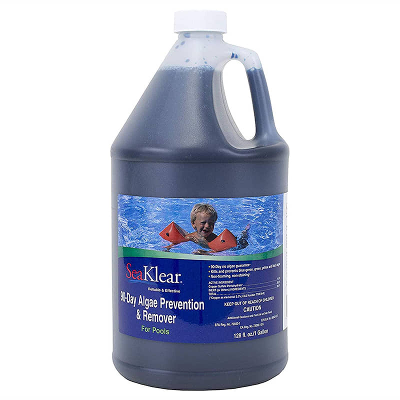 SeaKlear 90-Day Algae Prevention & Remover, 1 Gallon Bottle. kills & prevents blue-green, green, yellow & black algae. This product is effective against the likes of blue-green, black, and mustard algae. It is also formulated to be non-staining. 90-Day Algae Prevention & Remover is an excellent broad-spectrum algaecide with a long-term residual effect in the pool. It is based on a unique, low-dose organic copper complex, which is extremely effective and economical.