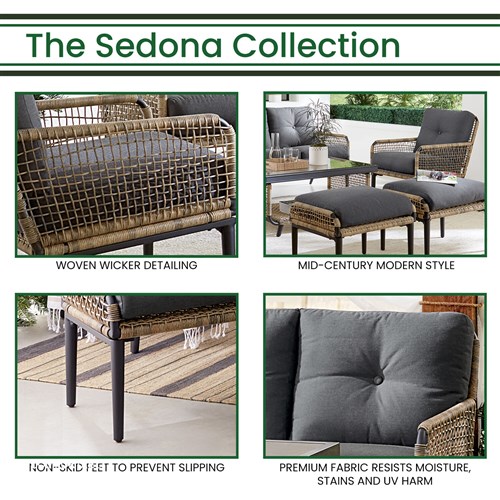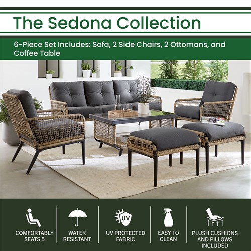 Get ready to update your outdoor oasis with the Sedona 6-Piece Chat Set from Hanover. This set is your newest destination for all things relaxation and includes a sofa, two side chairs, two ottomans, and a glass-top coffee table. Modern design meets natural textures, all made using hand-woven wicker accents and durable aluminum frames. The frames’ stylish natural tones are anchored by the sharp contrast of the plush cushions, covered with weather-resistant outdoor fabric that is quick-drying and soft to the touch. Rounding out the collection is the smoked glass-topped coffee table, boasting the same mixed material construction and long-lasting, rust-resistant aluminum frames as the rest of the collection. Made of weather resistant materials, these pieces allow you to maximize your time outdoors, even when you have minimal space.