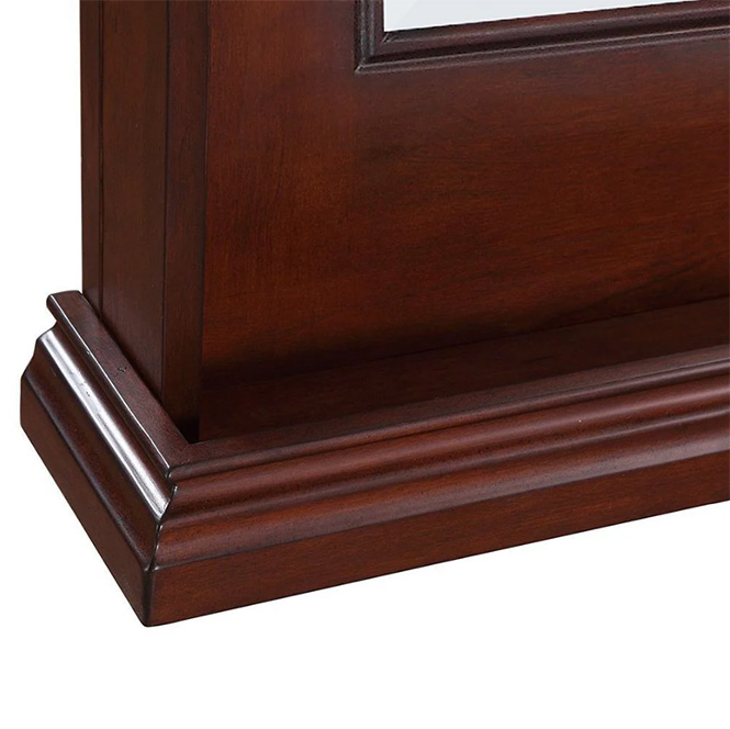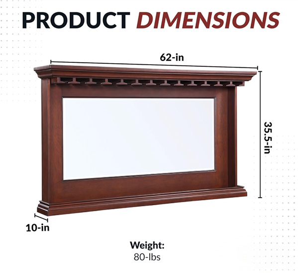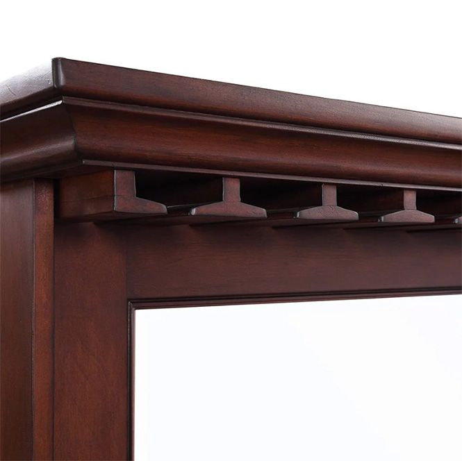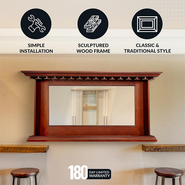 The oversized, beveled-edge bar mirror sports an elegantly sculptured wood frame. With a built-in bottom shelf to store your liquor bottles, and top stemware rack to display your wine glasses, this mirror instantly creates a beautiful focal point in any room. The Seville includes a reinforced, heavy-duty, Z-style wall mounting bracket that will evenly distribute the back bar mirror weight and ensure the mirror is properly secured to the wall.