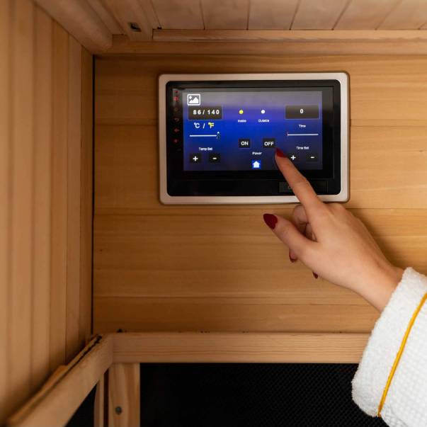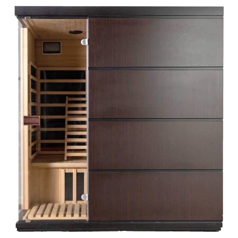 The Sirona 3 Person Hemlock Infrared Sauna features a sleek and contemporary design with unprecedented, innovative technology. The engineered-wood exterior panels laminated to “A” Grade, reforested Western Canadian hemlock provide maximum inner cabin heat-retention; while the stylish cabin design features an easy-clasp assembly system, safety glass, heavy-duty door hinges, commercial-grade heating panels, state-of-the-art touch screen control pad, high-performance speakers, interior lighting, chromotherapy, and ceiling accent lighting. The handsome, rich mahogany melamine exterior panels accented in black add the final touches to this ultra-modern design that is certain to be an elegant addition to any interior space.