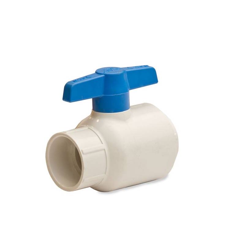 This Spears Utility Ball Valve, 1 in Nominal, Socket, 150 psi, 140 deg F, T-Handle Actuator, PVC Ball, 3-3/8 in Inlet to Outlet Length, 2-3/8 in Top to Inlet Center, PVC Body, PVC Stem Trim, EPDM Softgoods, White, Domestic