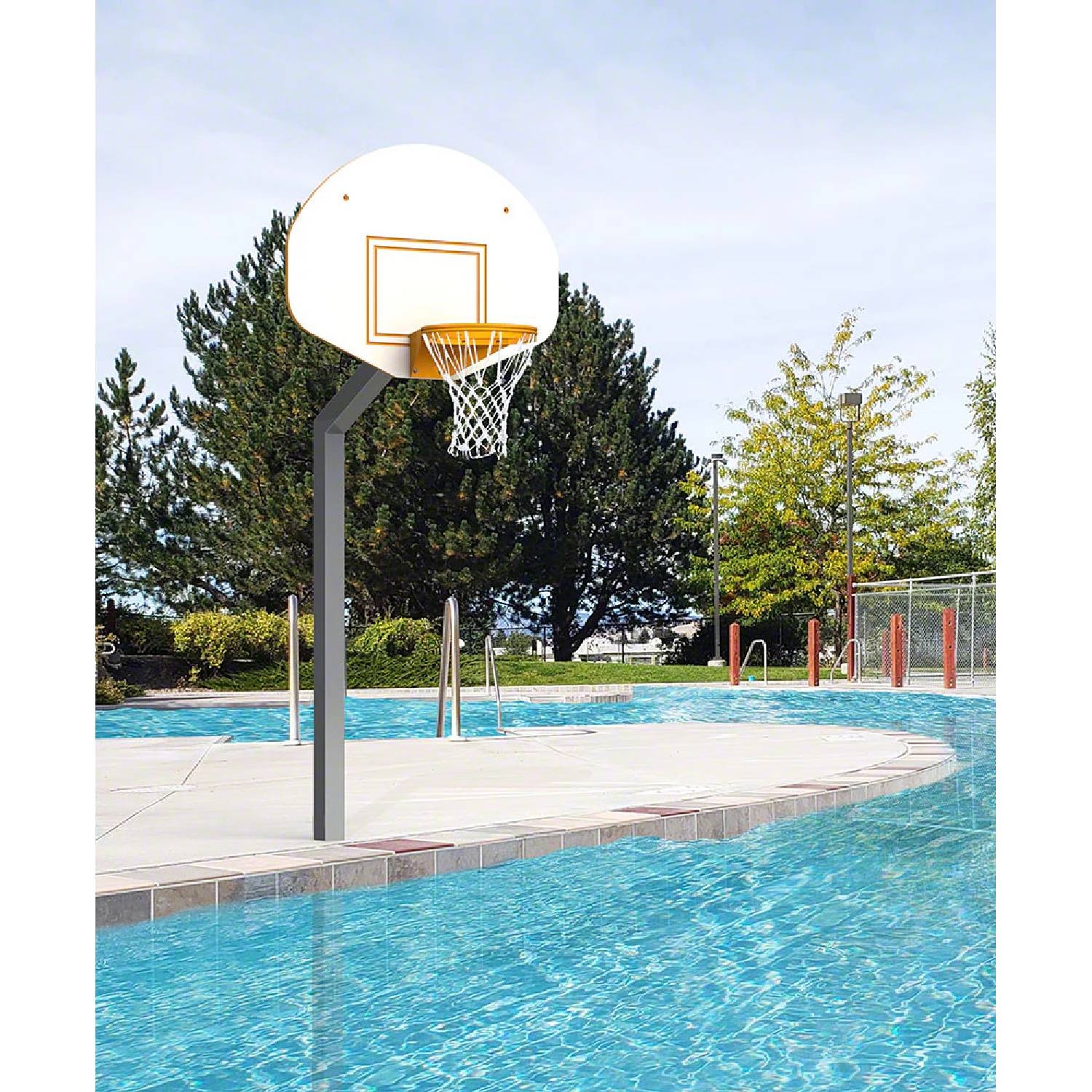 A heavy-duty rim and impact-resistant backboard promote consistent rebound action and realistic shot feedback, encouraging competitive play and skill-based engagement. The system’s professional appearance suits upscale aquatic facilities while contributing to a safer recreational setting through smooth surfaces and quality construction. A deck-mounted design allows secure installation while preserving efficient space use around the pool perimeter.