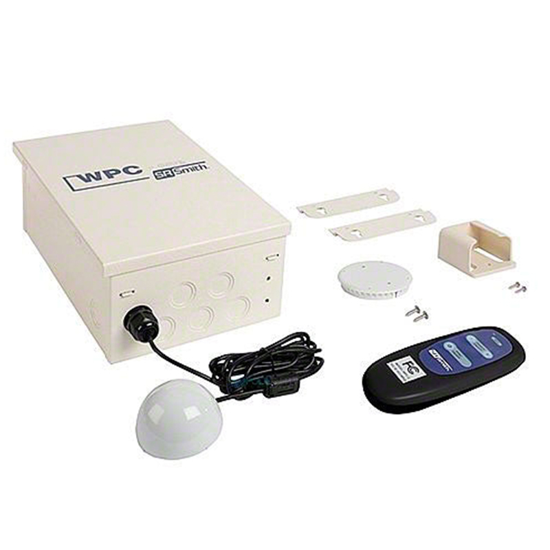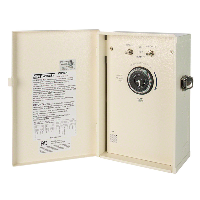 The SR Smith Wireless Pool Controller with Time Clock (WPC1) is a simple 12 or 120 Volt (30 watts or 8 amps) remote control system for a 1 speed pump and pool lights. It does not include a transformer. It can be operated by the included wireless remote, and features a three-position (On, Off, Auto), 24-hour time clock for pump control, along with two additional circuits for wireless lighting switching. There is a manual override switch on each light circuit.