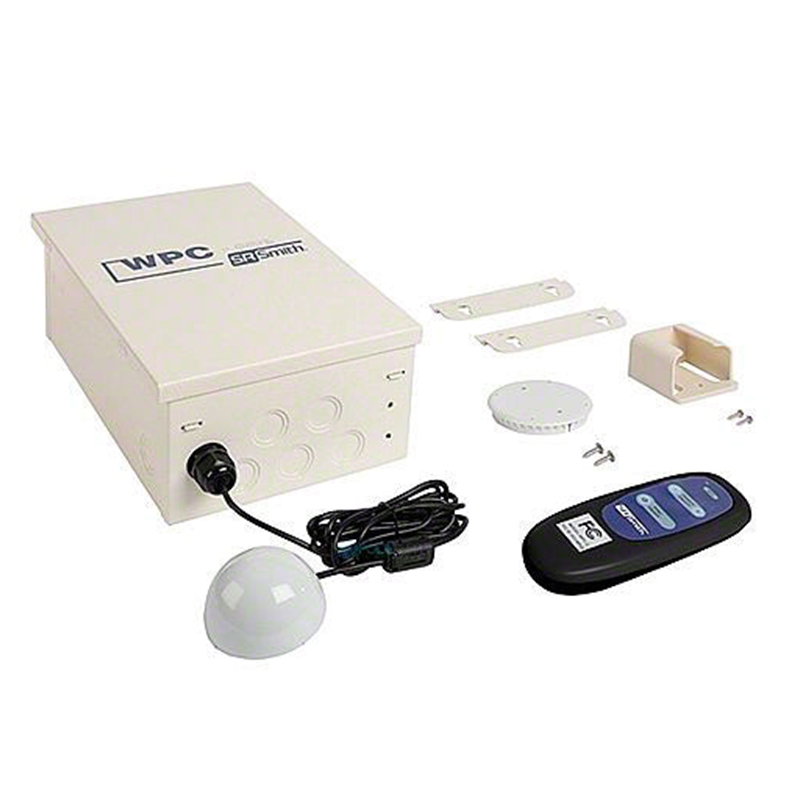 The SR Smith Wireless Pool Controller with Time Clock and Transformer (WPC1) with 30 watt transformer is a simple 12 or 120 Volt (30 watts or 8 amps) remote control system for a 1 speed pump and pool lights. It can be operated by the included wireless remote, and features a three-position (On, Off, Auto), 24-hour time clock for pump control, along with two additional circuits for wireless lighting switching. There is a manual override switch on each light circuit. This model also includes a 30 watt transformer making this system complete except for the lights and pump.