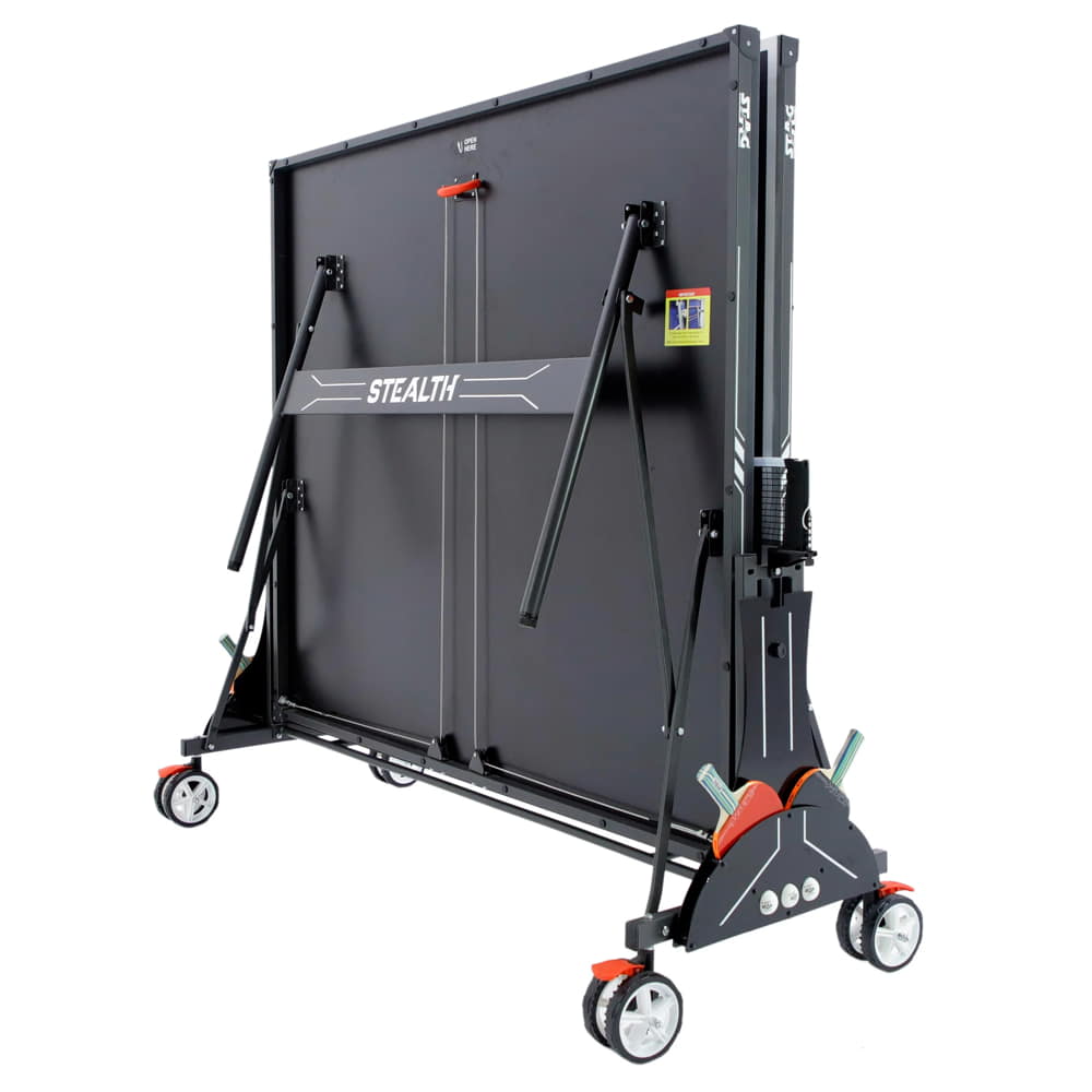 The Stag Stealth Indoor Table Tennis has a self-opening and self-closing leg system for easy storaging. For easier storaging of your table tennis accessories it also includes storage compartments for your rackets and balls. It has a permanent net system that will always stay in place, even when the table is folded for storage.