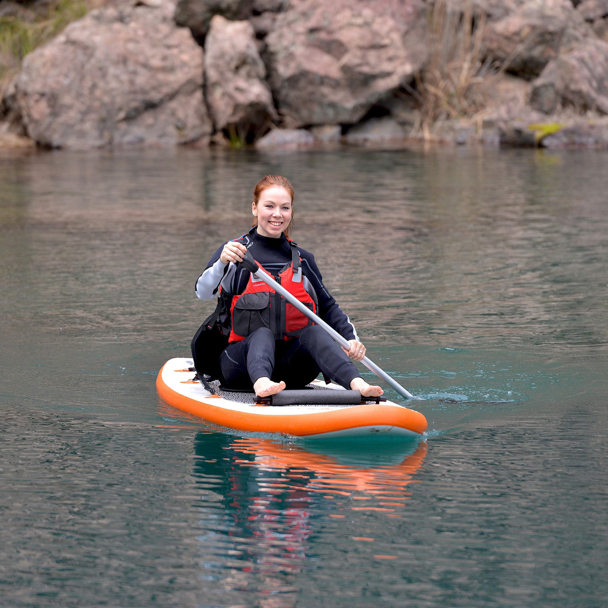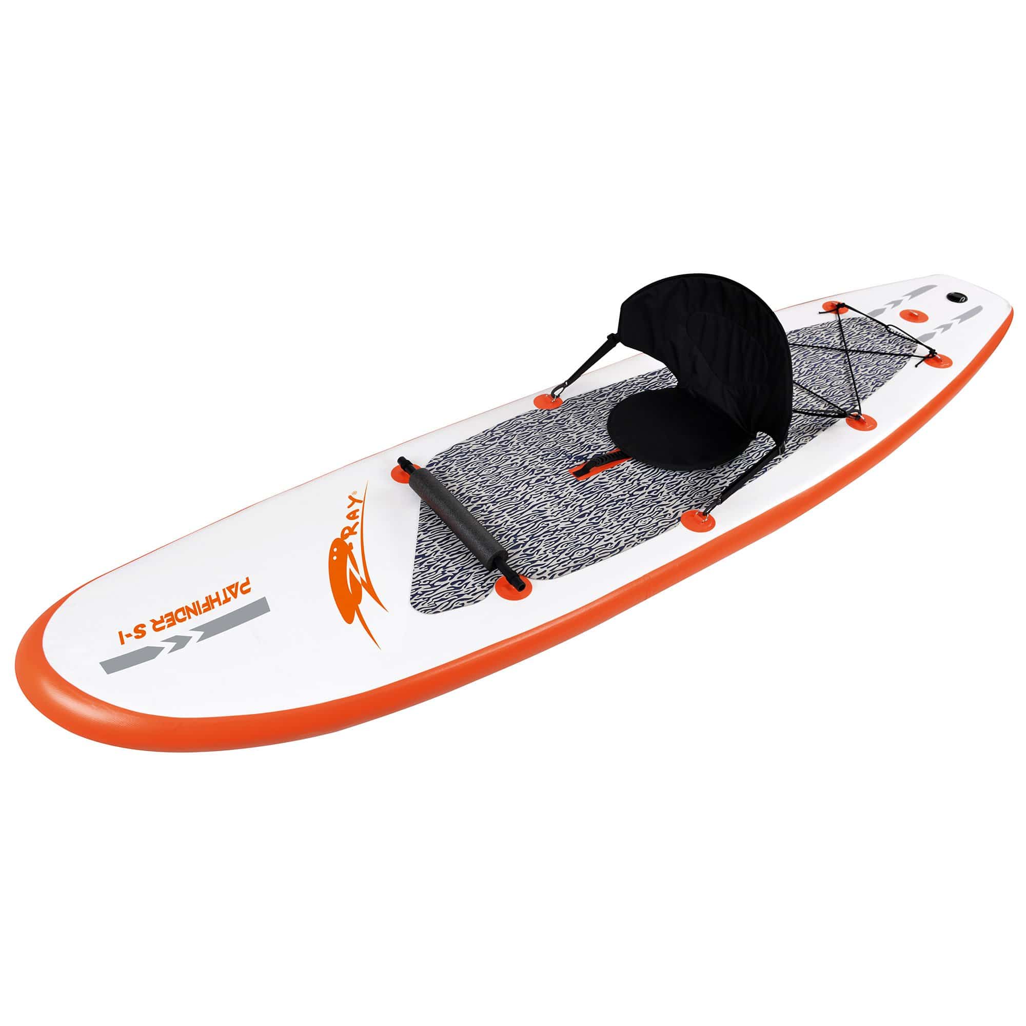 The Stingray 10-ft Inflatable Stand Up Paddleboard is a perfect all-around SUP package for riders up to 220 lbs. The Stingray is very versatile and easy to maneuver in calm water, yet durable and agile enough to perform excellently in swift moving water as well. Designed to provide endless fun in whatever type water your adventure takes you on. This complete package includes a 10-ft SUP board, 1 adjustable-removable heavy duty fabric seat, footrest, high-pressure air pump with pressure gauge, removable center tracking fin, bungee tie-down rings, 6-piece multi-purpose aluminum paddle/blade, and a rip-resistant polyethylene carry bag. Great for family fun, flat-water cruising, fitness, and yoga. 1-year Limited Warranty.
