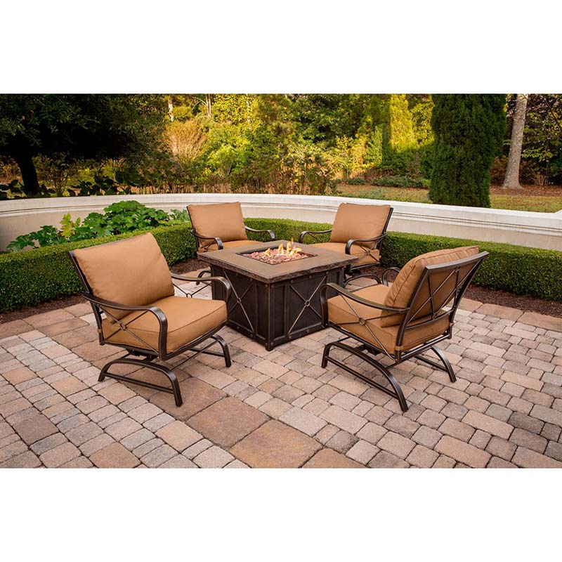 Stone Harbor 5 Piece Fire Pit Set: 4 cushion rockers, 40″ square fire pit