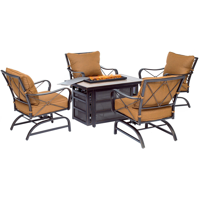 - COMFORTABLE WARM DESIGN: The Summer Nights Collection by Hanover includes four stylish and elegant oversize cushioned rocking chairs and 40″ stone-top fire pit. The 40,000 BTU fire pit accommodates a 20 lb. propane tank to warm up all your family and friends. Perfect addition to your patio, yard, deck, or porch.