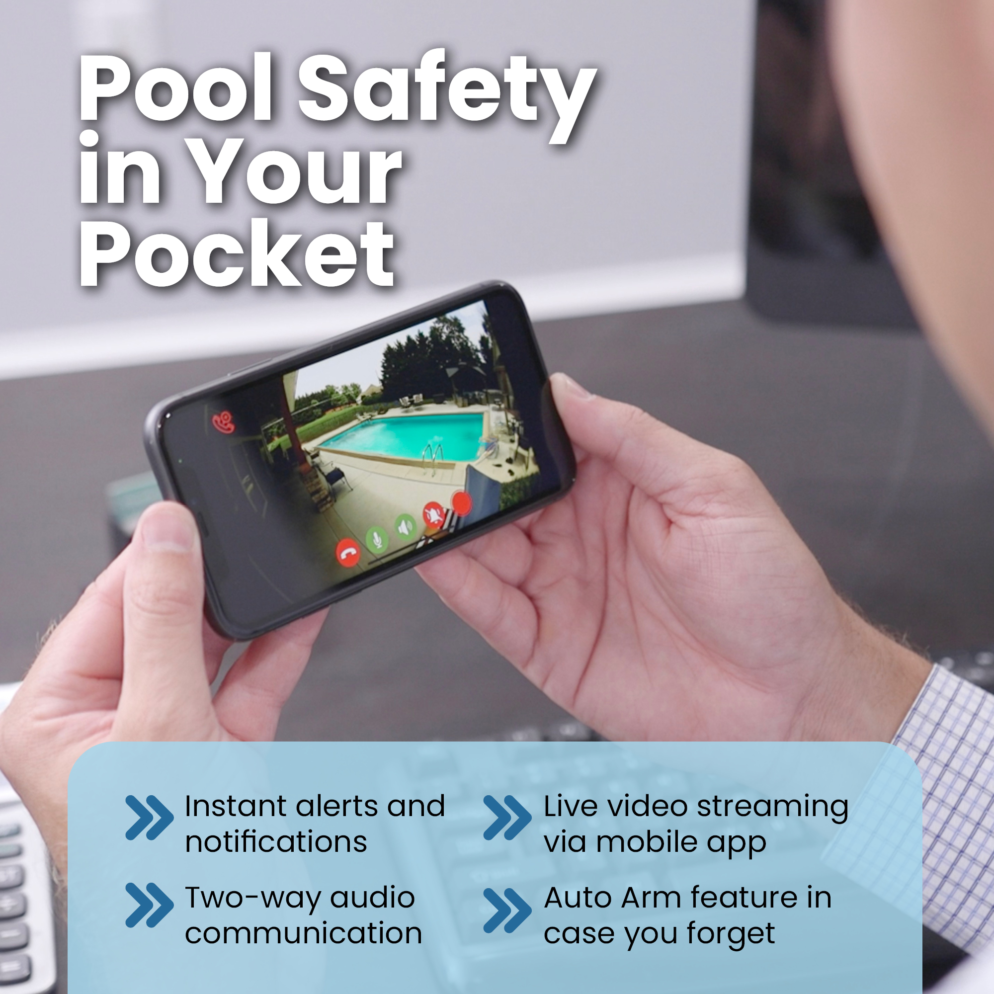 - By the pool from the camera’s two-way speaker
