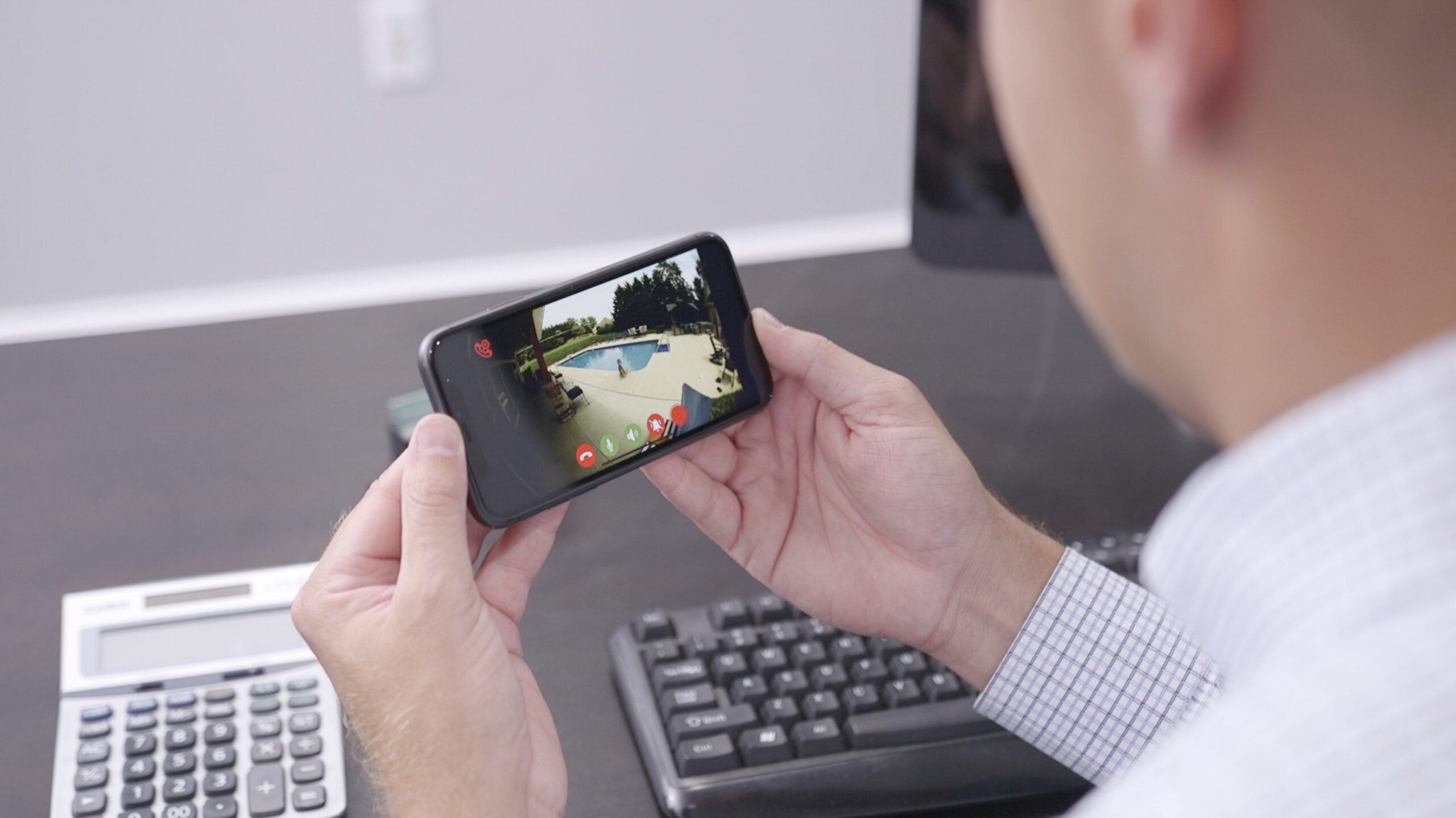 - By the pool from the camera’s two-way speaker