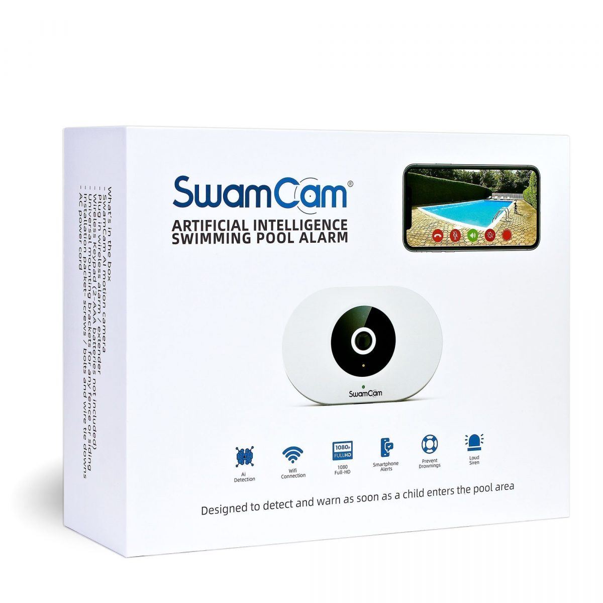 When activated, the SwamCam Pool Alarm System uses AI (Artificial Intelligence) technology to constantly scan the pool environment for human activity through its video camera.