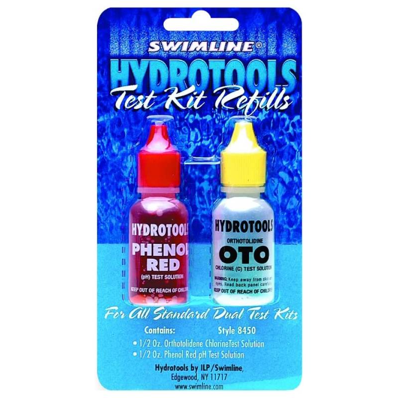 The Swimline 8450 swimming pool water test kit refills for Hydrotools Model 8410 and 8420 test kits with OTO and Phenol Red solutions in 1/2 ounce bottles