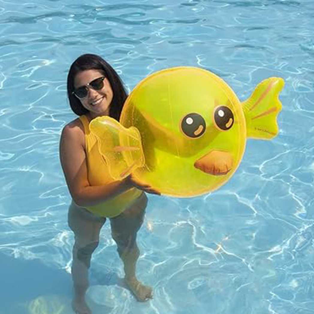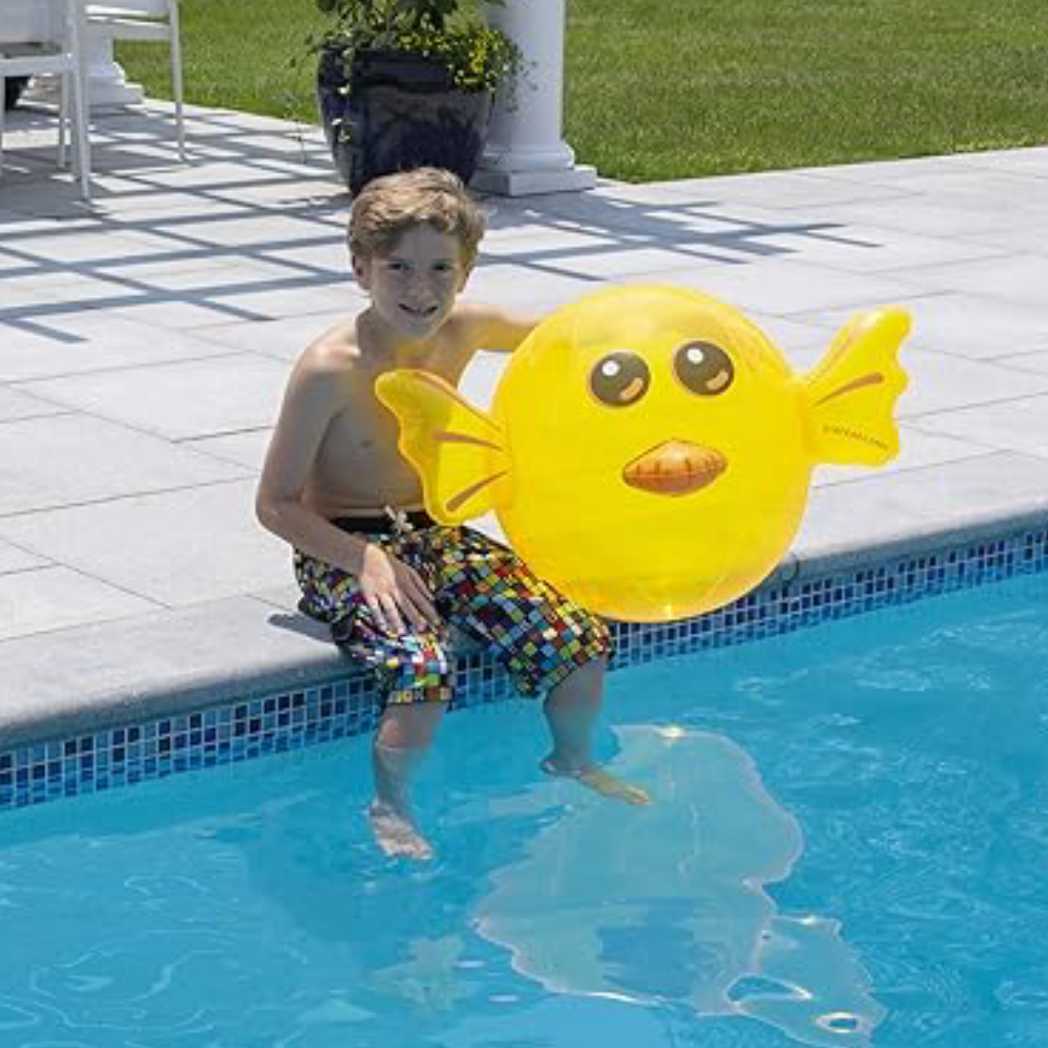The Swimline 90012 Inflatable Chick Beach Ball is a fun and adorable accessory for pool or beach play. This beach ball features a cute chick design that is sure to delight children and adults alike. Made from durable vinyl, it can endure vigorous play and outdoor conditions. The bright and cheerful design adds a playful touch to your aquatic activities. Easy to inflate and deflate, this beach ball is perfect for bringing along to any pool party or beach trip.