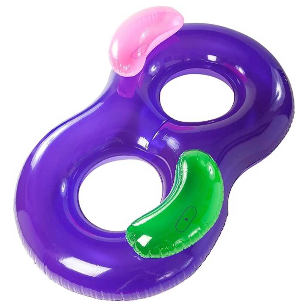 Relax with a friend on the Side By Side Double Ring Lounger Float. This float features two connected ring loungers, allowing you and a companion to lounge comfortably together. The durable vinyl construction ensures long-lasting use, while the built-in backrests provide additional support. The bright colors and fun design make it an attractive addition to any pool. Easy to inflate and deflate, this double ring lounger is perfect for socializing and relaxing in the sun.